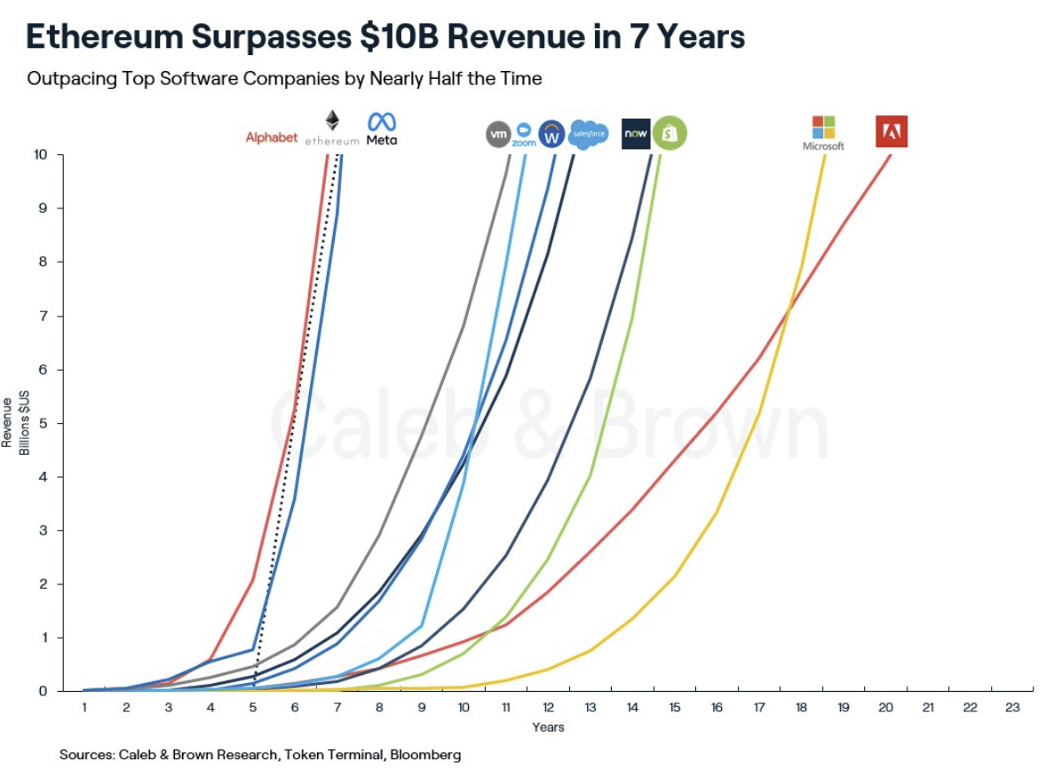 Hitting Milestones: Ethereum’s protocol revenue surpassed a whopping $10 billion, outshining giants like Microsoft and Adobe in the time it took to reach this feat. That’s right, Ethereum’s revenue is growing faster than many of the companies you’re familiar with: